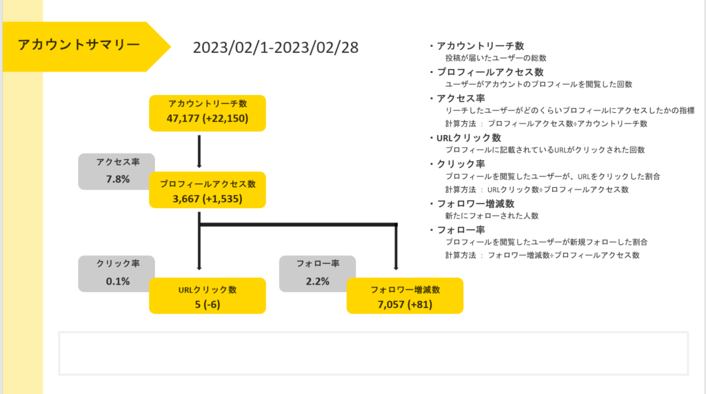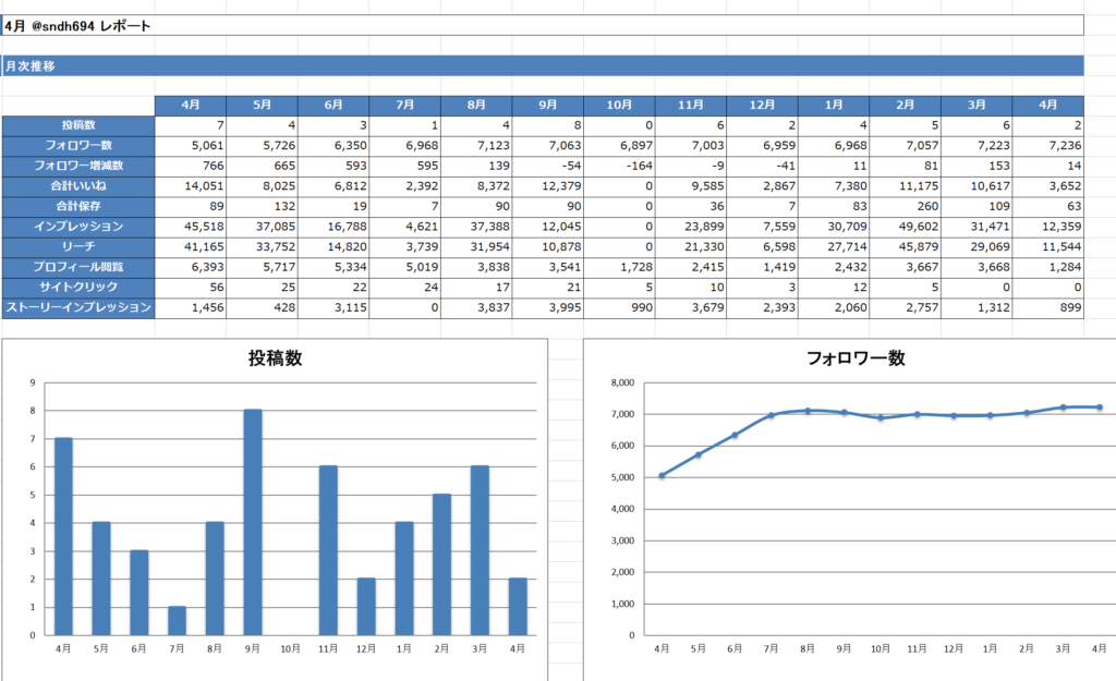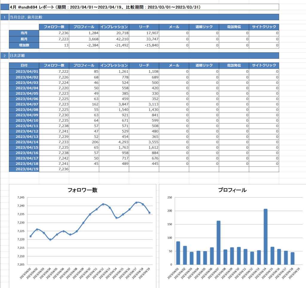 また下部では、フォロワー数やプロフィール数等、上部で表示しているデータをグラフや表で表示することができます。