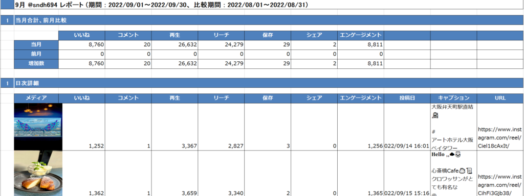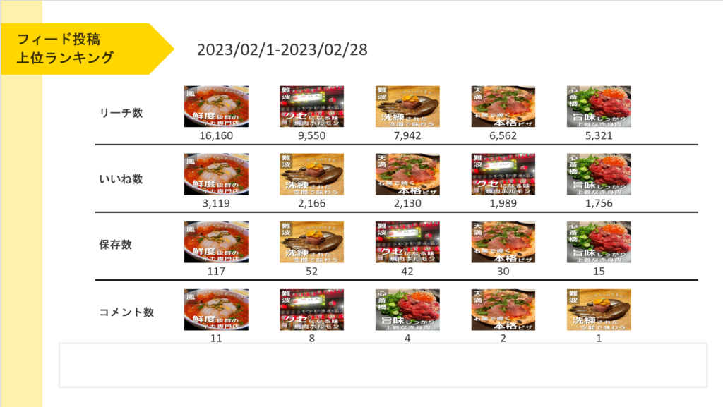 期間内の投稿について、リーチ数、いいね数、保存数、コメント数毎にランキング表示しております。