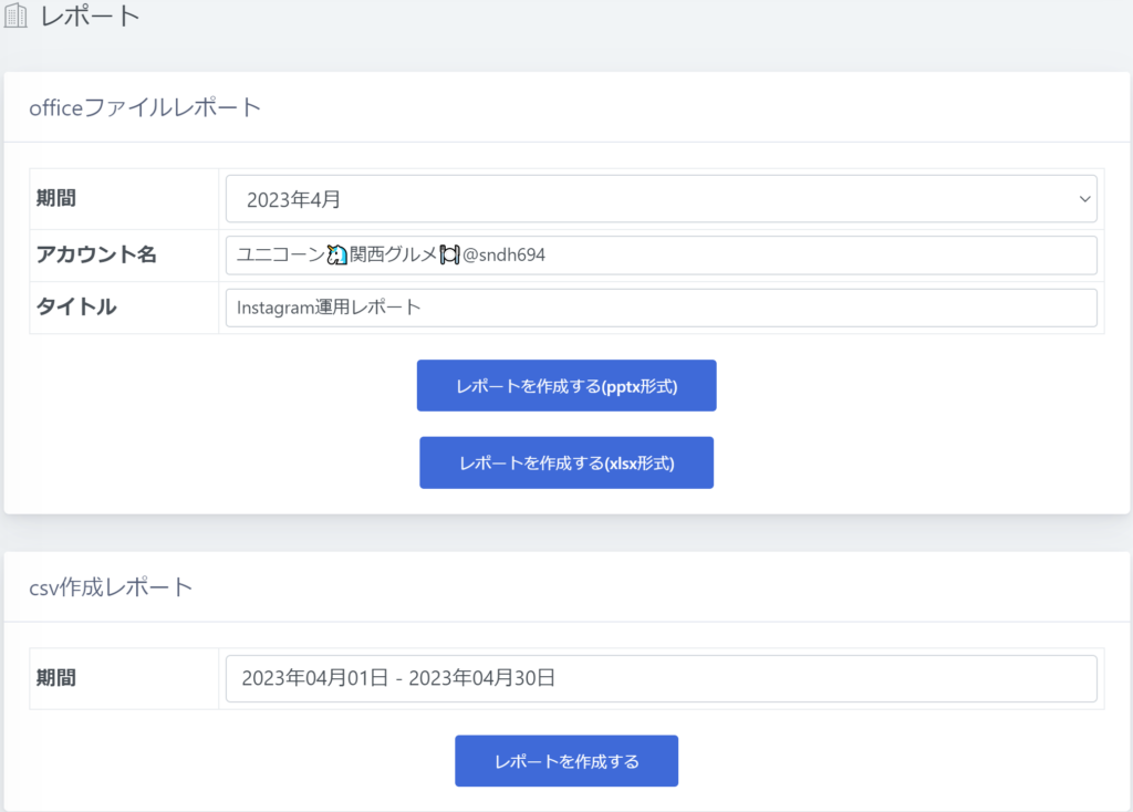 レポート機能では期間を選択し、期間内の投稿成果について、