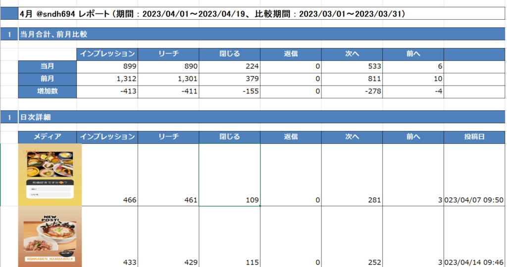 選択期間内の、ストーリーズ投稿データを表示することができます。