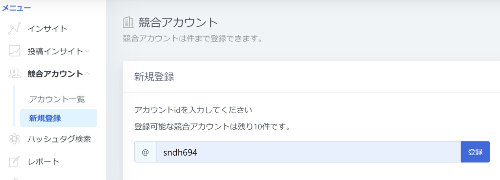 1.メニュー欄、【競合アカウント】→【新規登録】をクリックすると右図の画面が開きます。