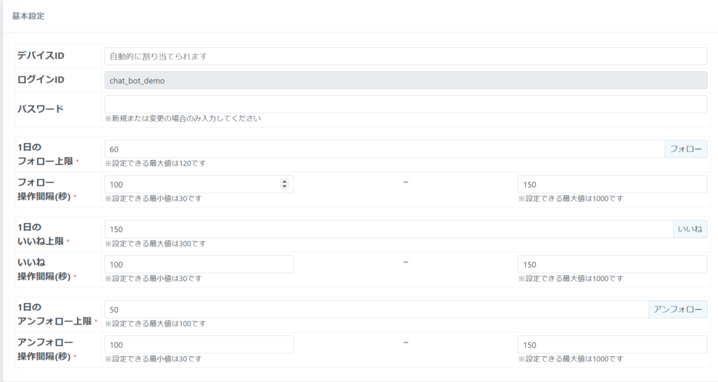 ※上限値とは、1日のアクションのうち最大で行動する数字です。よりヒトに近い動きをさせるため、設定値を上限に、日ごとにランダムでアクション数が変わります。