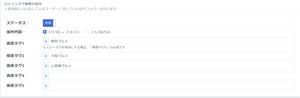 ⑵操作内容で、「いいね+フォロー」or「いいねのみ」かを選択